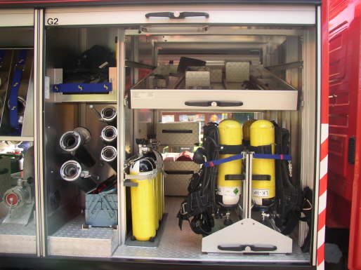 Beladung vonre rechts- Preßluftatmer mit Reserveflaschen- Besen und Schaufeln - Verbandskasten- Strahlrohre (B und C)- Werkzeugkasten- ...