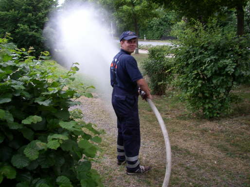 Der stellvertretende Ortsbrandmeister, Christian Kruse, probiert das Hohlstrahlrohr aus, das auf dem Fahrzeug vorhanden war. Damit kann z.B. bei einem Innenangriff eine deutlich bessere Löschwirkung erzielt werden, als das mit den C-Strahlrohren der Fall war. Die C-Strahlrohre werden natürlich immer noch benötigt.