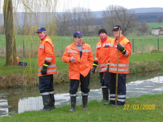 So ein Einsatz ist anstrengend. Nachdem alle Ölsperren gesetzt sind und das Öl auf dem Fischteich abgebunden ist, kann man nur noch abwarten. Die Zeit nutzen die Kameraden für eine kleine Pause, ehe es am Schwimmbad wieder weiter ging.