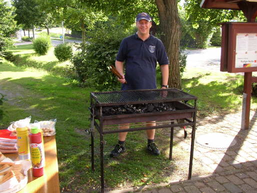 Uwe hat den Grill auch schon angefeuert. Die Rohrser Bürger können kommen.Wir hoffen ja, dass möglichst viele Bürger den Weg zum Feuerwehrhaus einschlagen.