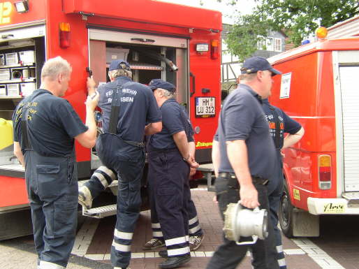 Nun müssen die Geräte vom TSF auf das TSF-W umgeladen werden. Da packen natürlich alle Kameraden mit an.