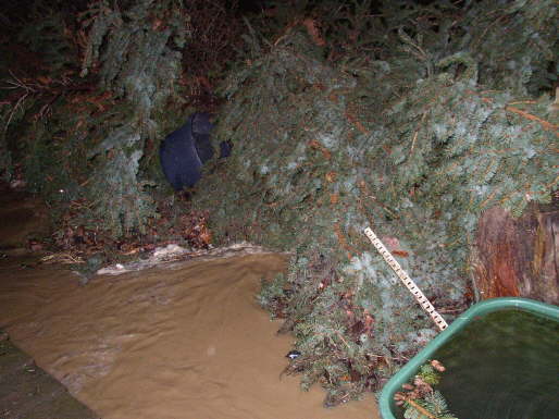 Eine umgestürzte Tanne liegt quer über dem Dorfbach.Der Dorfbach gleicht inzwischen eher einem reissenden Strom.