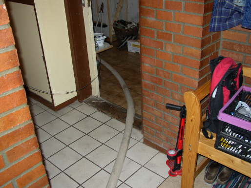 Die Schlauchleitung für die Spezialpumpe verläuft quer durch die Wohnung, da der direkte Zugang immer noch unter Wasser steht.