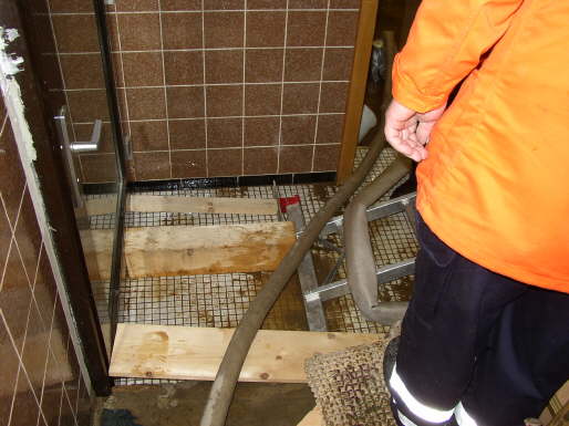 Die Tür musste von innen verkeilt werden, um das Wasser möglichst nicht eindringen zu lassen. Der Wassereinbruch konnte jedoch nicht gänzlich verhindert werden.